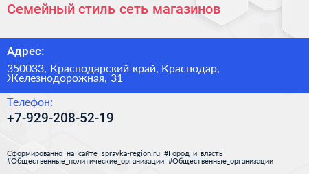 Семейный стиль, сеть магазинов по адресу 350033, Краснодарский край, Краснодар, Железнодорожная, 31 в дальнейшем Организация, размещена в следующих категориях: