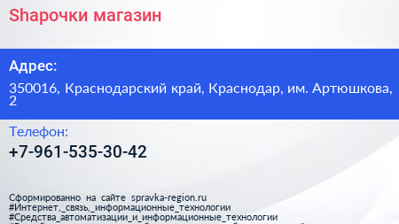 Shapочки, магазин по адресу 350016, Краснодарский край, Краснодар, им. Артюшкова, 2 в дальнейшем Организация, размещена в следующих категориях: