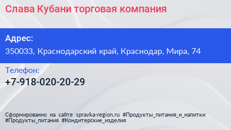 Слава Кубани, торговая компания по адресу 350033, Краснодарский край, Краснодар, Мира, 74 в дальнейшем Организация, размещена в следующих категориях:
