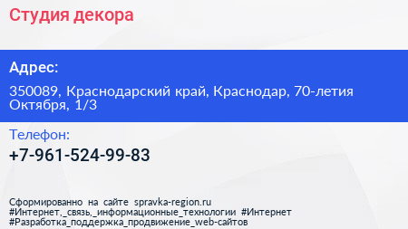 Студия декора по адресу 350089, Краснодарский край, Краснодар, 70-летия Октября, 1/3 в дальнейшем Организация, размещена в следующих категориях: