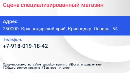 Сцена, специализированный магазин по адресу 350000, Краснодарский край, Краснодар, Ленина, 54 в дальнейшем Организация, размещена в следующих категориях: