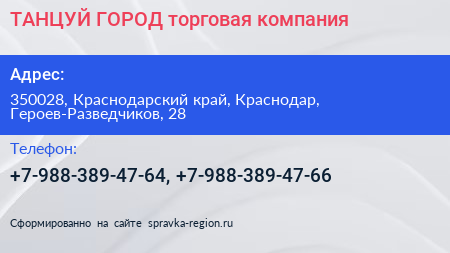 ТАНЦУЙ ГОРОД, торговая компания по адресу 350028, Краснодарский край, Краснодар, Героев-Разведчиков, 28 в дальнейшем Организация, размещена в следующих категориях: