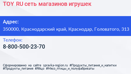 TOY.RU, сеть магазинов игрушек по адресу 350000, Краснодарский край, Краснодар, Головатого, 313 в дальнейшем Организация, размещена в следующих категориях: