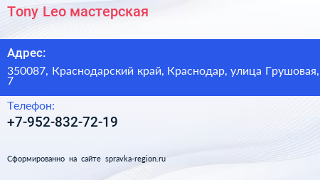 Tony & Leo, мастерская по адресу 350087, Краснодарский край, Краснодар, улица Грушовая, 7 в дальнейшем Организация, размещена в следующих категориях: