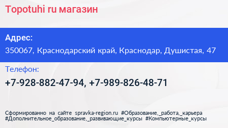 Topotuhi.ru, магазин по адресу 350067, Краснодарский край, Краснодар, Душистая, 47 в дальнейшем Организация, размещена в следующих категориях: