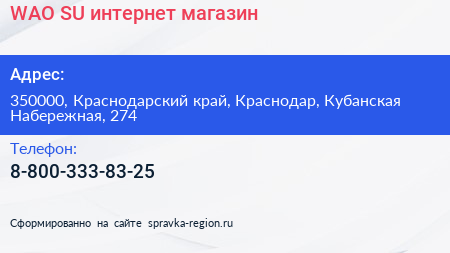 WAO.SU, интернет-магазин по адресу 350000, Краснодарский край, Краснодар, Кубанская Набережная, 274 в дальнейшем Организация, размещена в следующих категориях:
