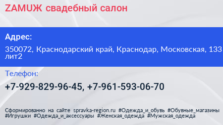ZAMUЖ, свадебный салон по адресу 350072, Краснодарский край, Краснодар, Московская, 133 лит2 в дальнейшем Организация, размещена в следующих категориях: