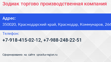 Зодиак, торгово-производственная компания по адресу 350020, Краснодарский край, Краснодар, Коммунаров, 266 в дальнейшем Организация, размещена в следующих категориях: