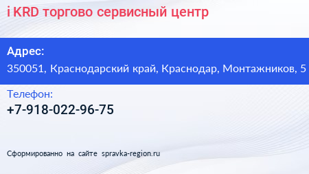 i-KRD, торгово-сервисный центр по адресу 350051, Краснодарский край, Краснодар, Монтажников, 5 в дальнейшем Организация, размещена в следующих категориях: