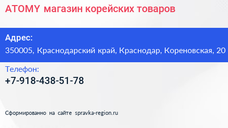 ATOMY, магазин корейских товаров по адресу 350005, Краснодарский край, Краснодар, Кореновская, 20 в дальнейшем Организация, размещена в следующих категориях: