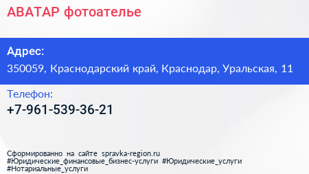 АВАТАР, фотоателье по адресу 350059, Краснодарский край, Краснодар, Уральская, 11 в дальнейшем Организация, размещена в следующих категориях: