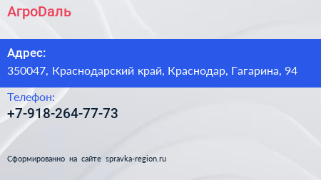 АгроDаль по адресу 350047, Краснодарский край, Краснодар, Гагарина, 94 в дальнейшем Организация, размещена в следующих категориях: