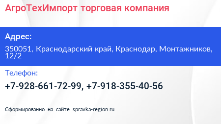 АгроТехИмпорт, торговая компания по адресу 350051, Краснодарский край, Краснодар, Монтажников, 12/2 в дальнейшем Организация, размещена в следующих категориях: