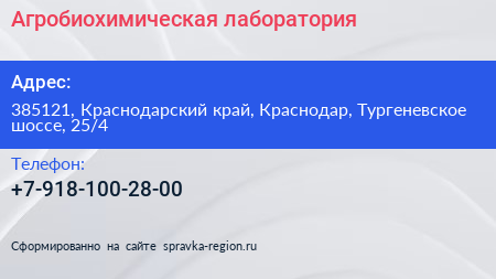 Агробиохимическая лаборатория по адресу 385121, Краснодарский край, Краснодар, Тургеневское шоссе, 25/4 в дальнейшем Организация, размещена в следующих категориях: