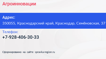Агроинновации по адресу 350055, Краснодарский край, Краснодар, Семёновская, 37 в дальнейшем Организация, размещена в следующих категориях: