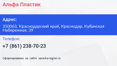 Альфа-Пластик по адресу 350063, Краснодарский край, Краснодар, Кубанская Набережная, 39 в дальнейшем Организация, размещена в следующих категориях: