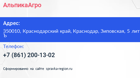 АльпикаАгро по адресу 350010, Краснодарский край, Краснодар, Зиповская, 5 лит Ъ в дальнейшем Организация, размещена в следующих категориях:
