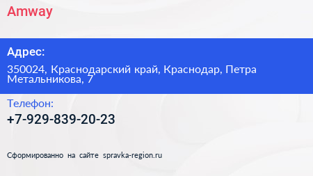 Amway по адресу 350024, Краснодарский край, Краснодар, Петра Метальникова, 7 в дальнейшем Организация, размещена в следующих категориях: