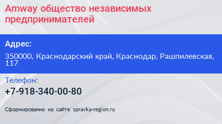 Amway, общество независимых предпринимателей по адресу 350000, Краснодарский край, Краснодар, Рашпилевская, 117 в дальнейшем Организация, размещена в следующих категориях: