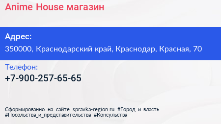 Anime House, магазин по адресу 350000, Краснодарский край, Краснодар, Красная, 70 в дальнейшем Организация, размещена в следующих категориях: