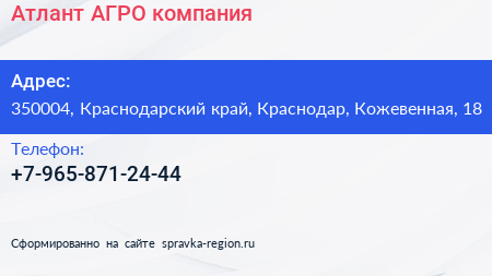Атлант-АГРО, компания по адресу 350004, Краснодарский край, Краснодар, Кожевенная, 18 в дальнейшем Организация, размещена в следующих категориях: