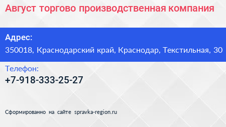 Август, торгово-производственная компания по адресу 350018, Краснодарский край, Краснодар, Текстильная, 30 в дальнейшем Организация, размещена в следующих категориях:
