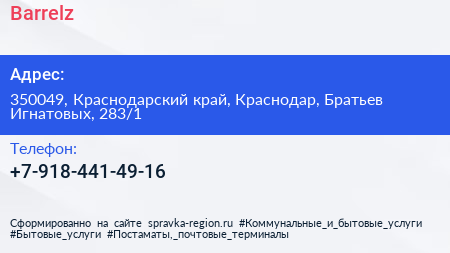 Barrelz по адресу 350049, Краснодарский край, Краснодар, Братьев Игнатовых, 283/1 в дальнейшем Организация, размещена в следующих категориях: