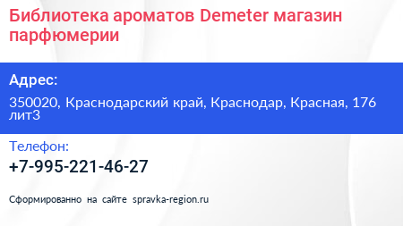 Библиотека ароматов+Demeter, магазин парфюмерии по адресу 350020, Краснодарский край, Краснодар, Красная, 176 лит3 в дальнейшем Организация, размещена в следующих категориях:
