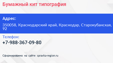 Бумажный кит, типография по адресу 350058, Краснодарский край, Краснодар, Старокубанская, 92 в дальнейшем Организация, размещена в следующих категориях: