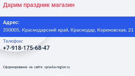 Дарим праздник, магазин по адресу 350005, Краснодарский край, Краснодар, Кореновская, 21 в дальнейшем Организация, размещена в следующих категориях: