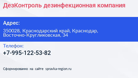 ДезКонтроль, дезинфекционная компания по адресу 350028, Краснодарский край, Краснодар, Восточно-Кругликовская, 34 в дальнейшем Организация, размещена в следующих категориях: