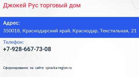 Джокей Рус, торговый дом по адресу 350018, Краснодарский край, Краснодар, Текстильная, 21 в дальнейшем Организация, размещена в следующих категориях:
