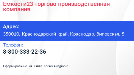 Емкости23, торгово-производственная компания по адресу 350010, Краснодарский край, Краснодар, Зиповская, 5 в дальнейшем Организация, размещена в следующих категориях: