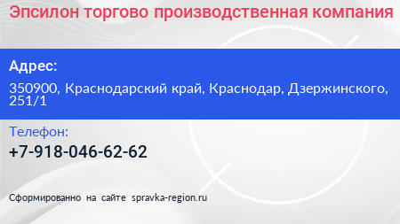 Эпсилон, торгово-производственная компания по адресу 350900, Краснодарский край, Краснодар, Дзержинского, 251/1 в дальнейшем Организация, размещена в следующих категориях: