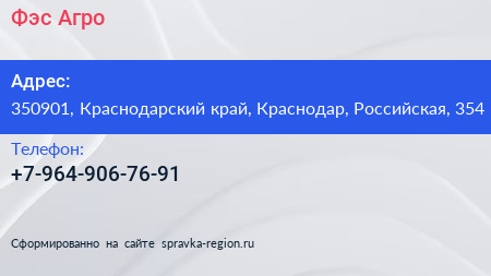 Фэс-Агро по адресу 350901, Краснодарский край, Краснодар, Российская, 354 в дальнейшем Организация, размещена в следующих категориях: