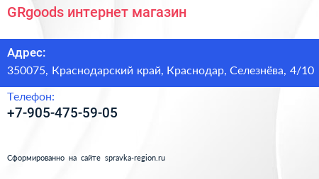 GRgoods, интернет-магазин по адресу 350075, Краснодарский край, Краснодар, Селезнёва, 4/10 в дальнейшем Организация, размещена в следующих категориях: