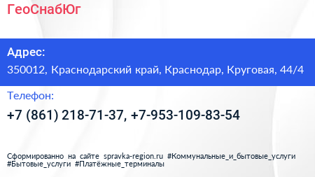 ГеоСнабЮг по адресу 350012, Краснодарский край, Краснодар, Круговая, 44/4 в дальнейшем Организация, размещена в следующих категориях: