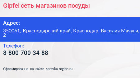 Gipfel, сеть магазинов посуды по адресу 350061, Краснодарский край, Краснодар, Василия Мачуги, 2 в дальнейшем Организация, размещена в следующих категориях: