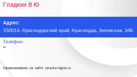 Гладких В.Ю. по адресу 350016, Краснодарский край, Краснодар, Зиповская, 34Б в дальнейшем Организация, размещена в следующих категориях: