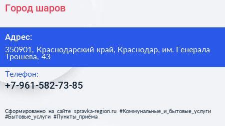 Город шаров по адресу 350901, Краснодарский край, Краснодар, им. Генерала Трошева, 43 в дальнейшем Организация, размещена в следующих категориях: