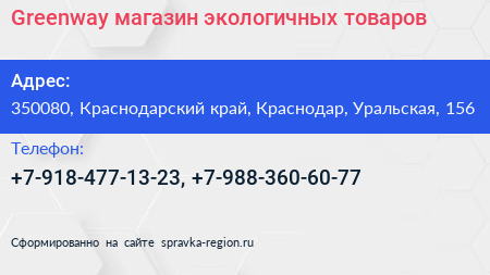 Greenway, магазин экологичных товаров по адресу 350080, Краснодарский край, Краснодар, Уральская, 156 в дальнейшем Организация, размещена в следующих категориях:
