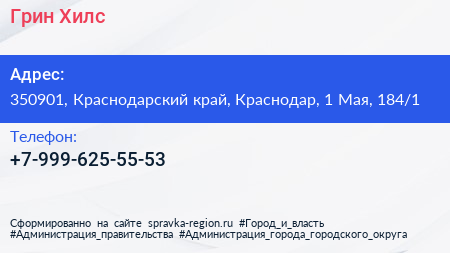 Грин Хилс по адресу 350901, Краснодарский край, Краснодар, 1 Мая, 184/1 в дальнейшем Организация, размещена в следующих категориях: