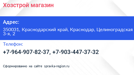 Хозстрой, магазин по адресу 350031, Краснодарский край, Краснодар, Целиноградская 3-я, 2 в дальнейшем Организация, размещена в следующих категориях: