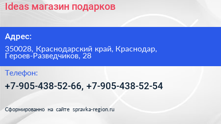 Ideas, магазин подарков по адресу 350028, Краснодарский край, Краснодар, Героев-Разведчиков, 28 в дальнейшем Организация, размещена в следующих категориях: