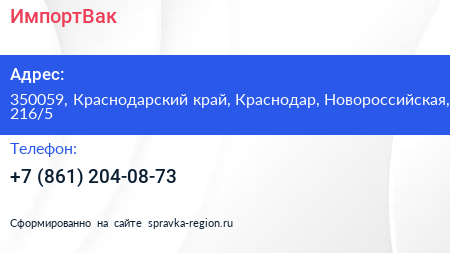 ИмпортВак по адресу 350059, Краснодарский край, Краснодар, Новороссийская, 216/5 в дальнейшем Организация, размещена в следующих категориях: