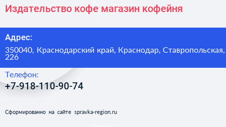 Издательство кофе, магазин-кофейня по адресу 350040, Краснодарский край, Краснодар, Ставропольская, 226 в дальнейшем Организация, размещена в следующих категориях: