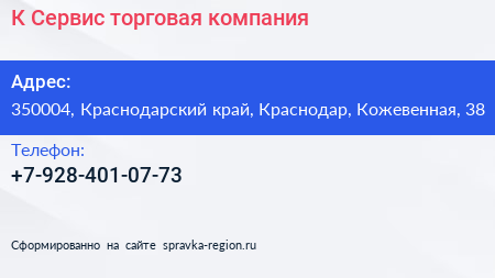 К-Сервис, торговая компания по адресу 350004, Краснодарский край, Краснодар, Кожевенная, 38 в дальнейшем Организация, размещена в следующих категориях: