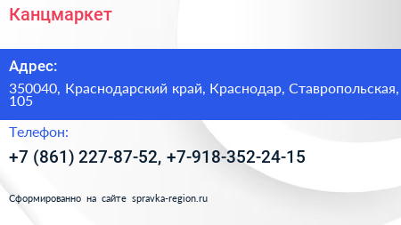 Канцмаркет по адресу 350040, Краснодарский край, Краснодар, Ставропольская, 105 в дальнейшем Организация, размещена в следующих категориях: