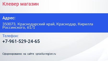 Клевер, магазин по адресу 350073, Краснодарский край, Краснодар, Кирилла Россинского, 61/1 в дальнейшем Организация, размещена в следующих категориях: