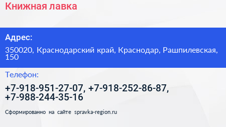 Книжная лавка по адресу 350020, Краснодарский край, Краснодар, Рашпилевская, 150 в дальнейшем Организация, размещена в следующих категориях: